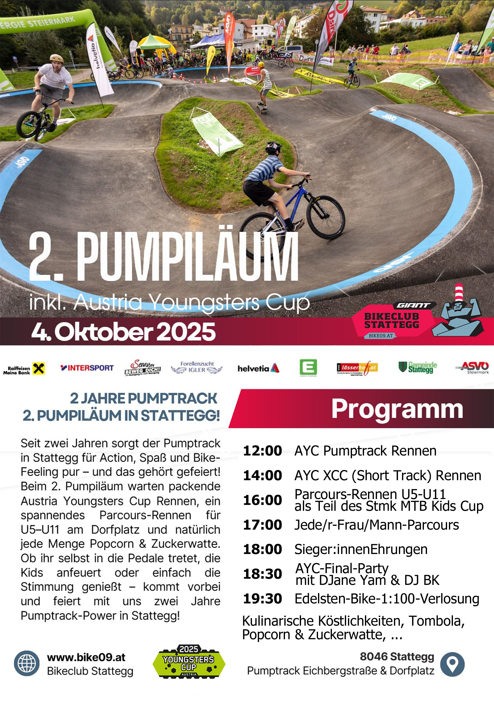 Ab 16:00 Uhr startet ebendort das Stmk. Kidscup-Parcours-Rennen U5-U11. Ab 17:00 Uhr ist diese Strecke für U13-U99 "Athlet:innen" geöffnet. Nach der Sieger:innen-Ehrung um ca. 18:00 Uhr beginnt die Youngsters Final-Party mit DJane Yam und DJ BK (a. o. DJ FJ (Weltmeister Franz-Josef Lässer) und DJ TH (Vize-Weltmeister Theo Hauser).